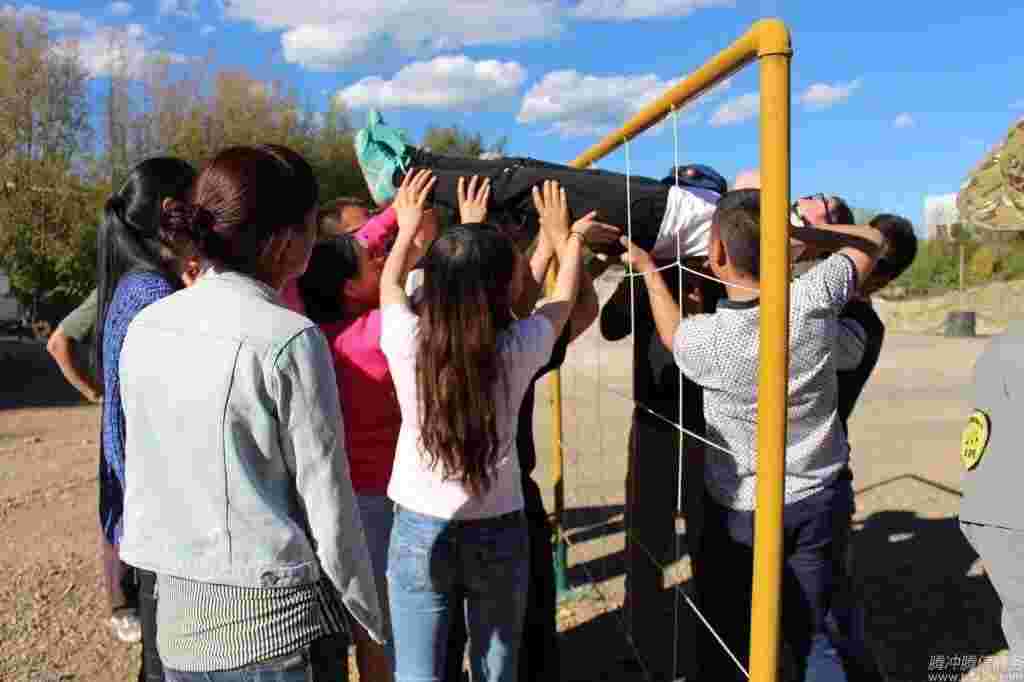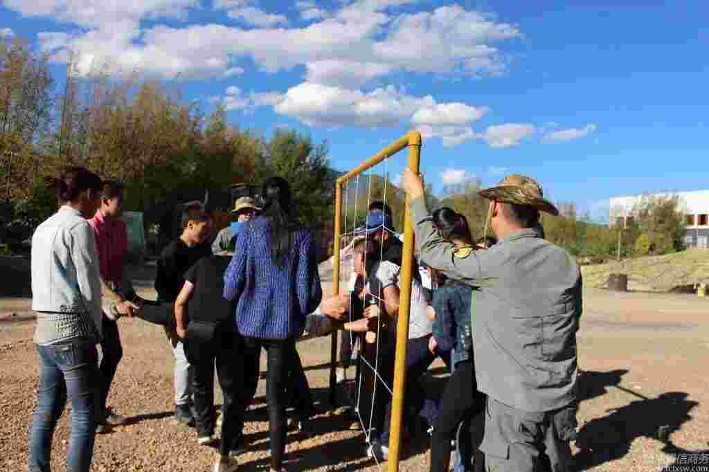 穿越電網,是一項挑戰性很強的、典型的拓展訓練活動。要求全體隊員在規定的時間內,從網的一邊穿越到另一邊,每一個網眼只能有一人通過一次,這就意味著,不同的人要通過不同的網眼。每個大小不同、高低不同的網眼代表著不同的分值。小組的目標很明確,就是要在規定的時間內,爭取最高分。